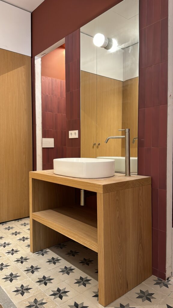 La intervención combina materiales cálidos como la madera con revestimientos cerámicos y acabados continuos, creando espacios equilibrados y serenos. La iluminación, cuidadosamente integrada, acompaña la arquitectura y realza tanto los detalles constructivos como la materialidad del conjunto.
